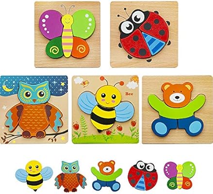 أحجية تركيب الصور الخشبية من Hzone للأطفال الصغار من سن 1 و2 و3 سنوات عبوة من 5 قطع ألعاب تعليمية مبكرة هدية للأولاد والبنات مع 5 أنماط لطيفة لعبة أشكال خشبية بألوان