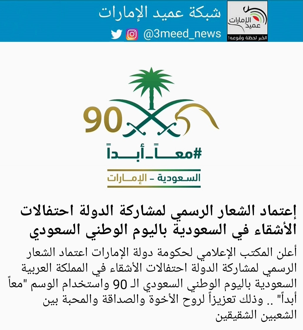 شبكة عميد الإمارات أعلن المكتب الإعلامي لحكومة دولة الإمارات اعتماد الشعار الرسمي لمشاركة الدولة احتفالات الأشقاء في المملكة العربية السعودية باليوم الوطني السعودي ال 90 واستخدام الوسم معا أبدا وذلك