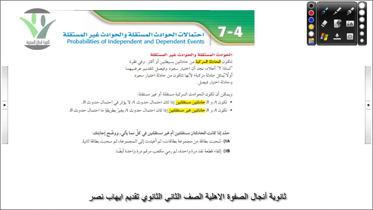 رياضيات ثاني ثانوي درس احتمال الحوادث المستقلة والحوادث غير المستقلة Youtube
