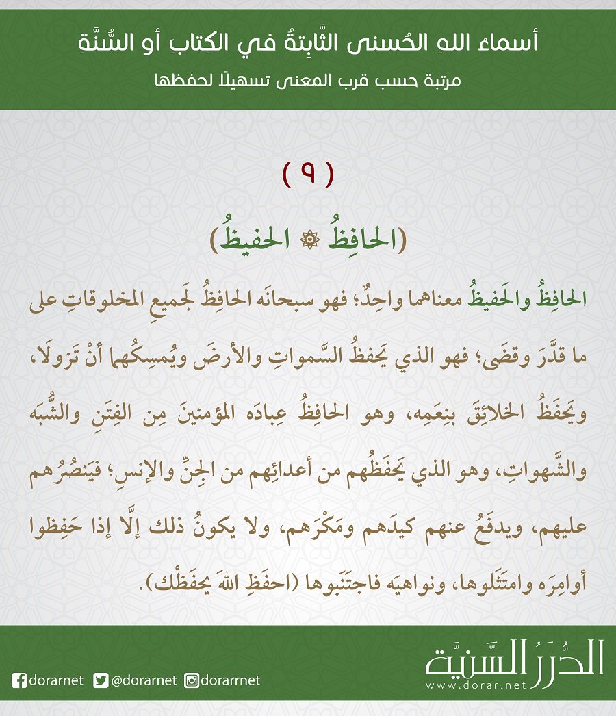 موقع الدرر الس ني ة در توییتر معانى أسماء الله الحسنى الحافظ الحفيظ قال تعالى وربك على كل شيء حفيظ وقال فالله خير حافظا قال السعدي الحفيظ الذي حفظ ما خلقه وأحاط علمه بما أوجده والحافظ أنه تعالى الحافظ لعباده من
