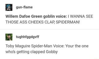 Gun Flame Willem Dafoe Green Goblin Voice I Wanna See Those Ass Cheeks Clap Spiderman Tughhfggdgvff Toby Maguire Spider Man Voice Your The One Who S Getting Clapped Gobby Toby Maguire Best Spidey Green