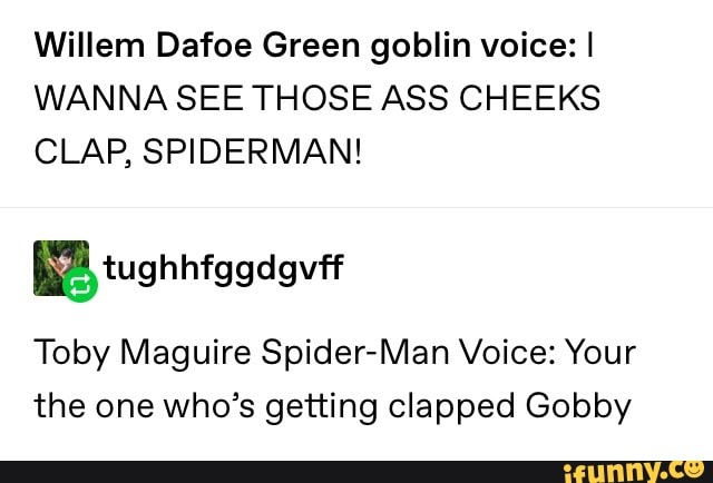 Willem Dafoe Green Goblin Voice I Wanna See Those Ass Cheeks Clap Spiderman Toby Maguire Spider Man Voice Your The One Who S Getting Clapped Gobby Ifunny